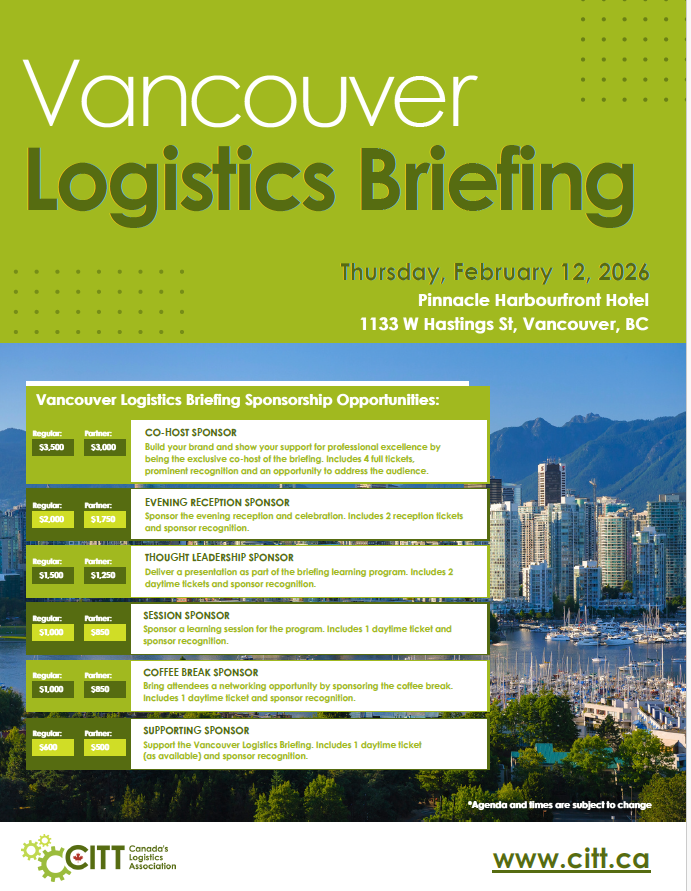 Show your support for the industry in Vancouver and grow your brand's profile by taking part in the Vancouver Logistics Briefing as a sponsor. Click the image below to view a detailed list of the opportunities. Contact Rachel at rjonas@citt.ca to book a package