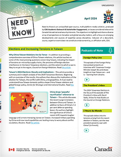 Need to Know is an unclassified open-source, multi-platform media collation, produced by CSIS Academic Outreach & Stakeholder Engagement, on issues considered relevant to Canada’s broad national security interests. The objective is to highlight and share a diverse array of perspectives on Canadian and global security matters, with a focus on emerging